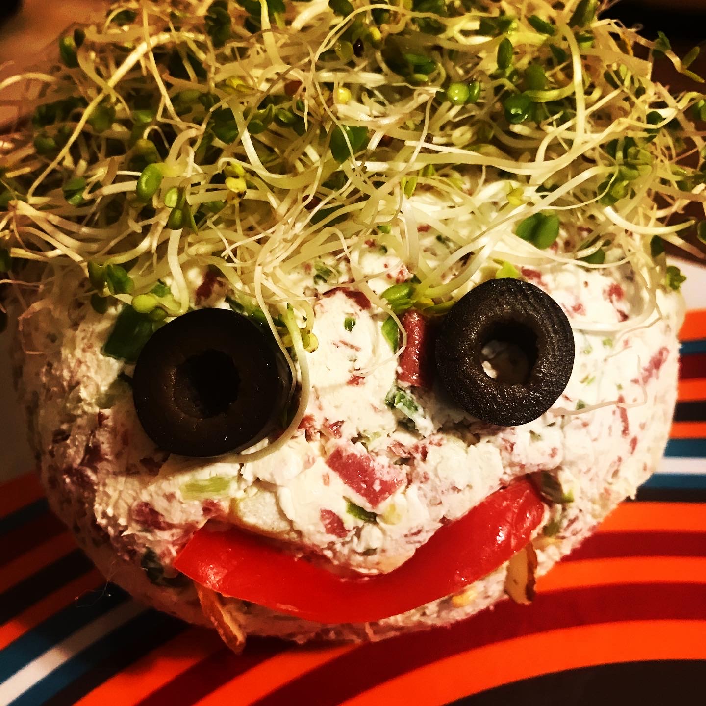 NOTE: To spice up your Halloween party, use fresh alfalfa sprouts, sliced black olives, a strip of roasted red pepper, and slivered almonds to transform this innocent snack into a fiendishly tasty ghoul.